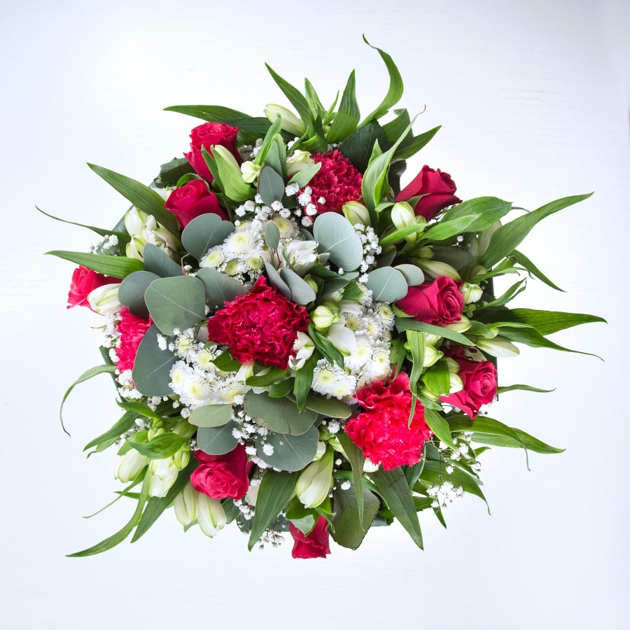 Our Elegant Harmony Bouquet is a masterpiece of floral design, combining vibrant red roses, pristine white chrysanthemums, and playful carnations. Gypsophila adds a delicate touch, while white alstroemeria and aspidistra leaves provide a lush backdrop.