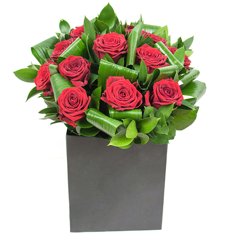 Elevate your gift with our Graceful Red Rose & Green Foliage Arrangement. This beautifully composed bouquet pairs vivid red roses with the natural charisma of aspidistra leaves and the refined touch of ruscus, ensuring every stem radiates luxury.